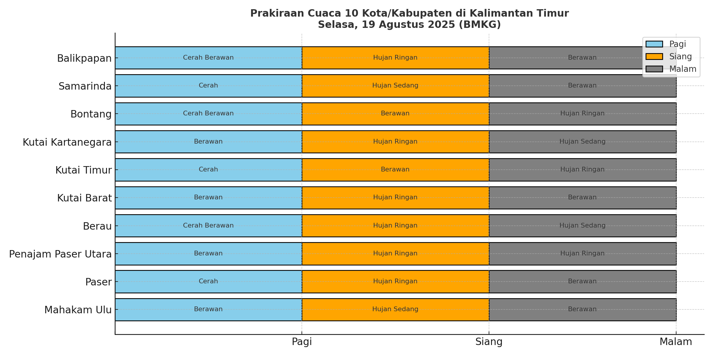 BALIKPAPAN, Inibalikpapan.com – Badan Meteorologi, Klimatologi, dan Geofisika (BMKG) merilis prakiraan cuaca untuk 10 kota/kabupaten di Kaltim pada Selasa, 19 Agustus 2025.