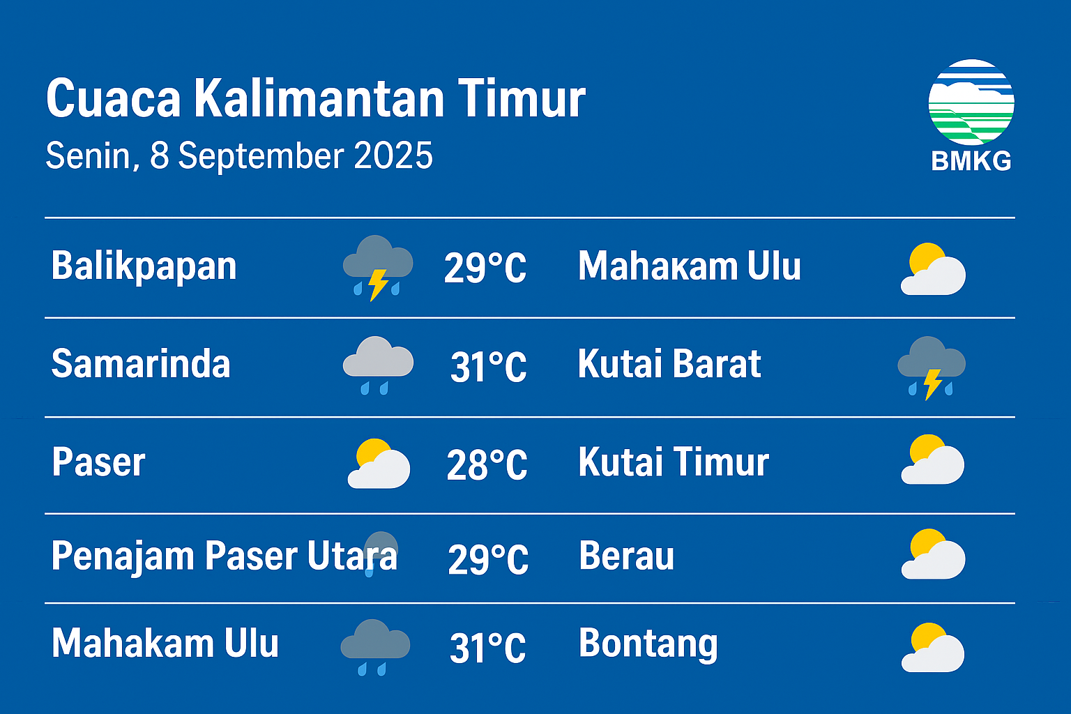Kondisi serupa juga terjadi di ibu kota Kaltim. BMKG mencatat badai petir diperkirakan turun pada pagi hingga siang, dengan suhu siang hari bisa menembus 31°C. Sore hingga malam cuaca cenderung berawan.