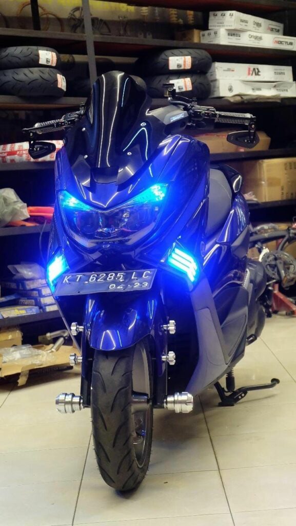 Bukan hanya warna baru di sekujur body NMax milik Rizki namun velg motor pun mendapat polesan warna lebih fresh. Selain itu tambahan aksesori pun dipasang beberapa titik, seperti handle rem, termasuk spion yang lebih menawan.