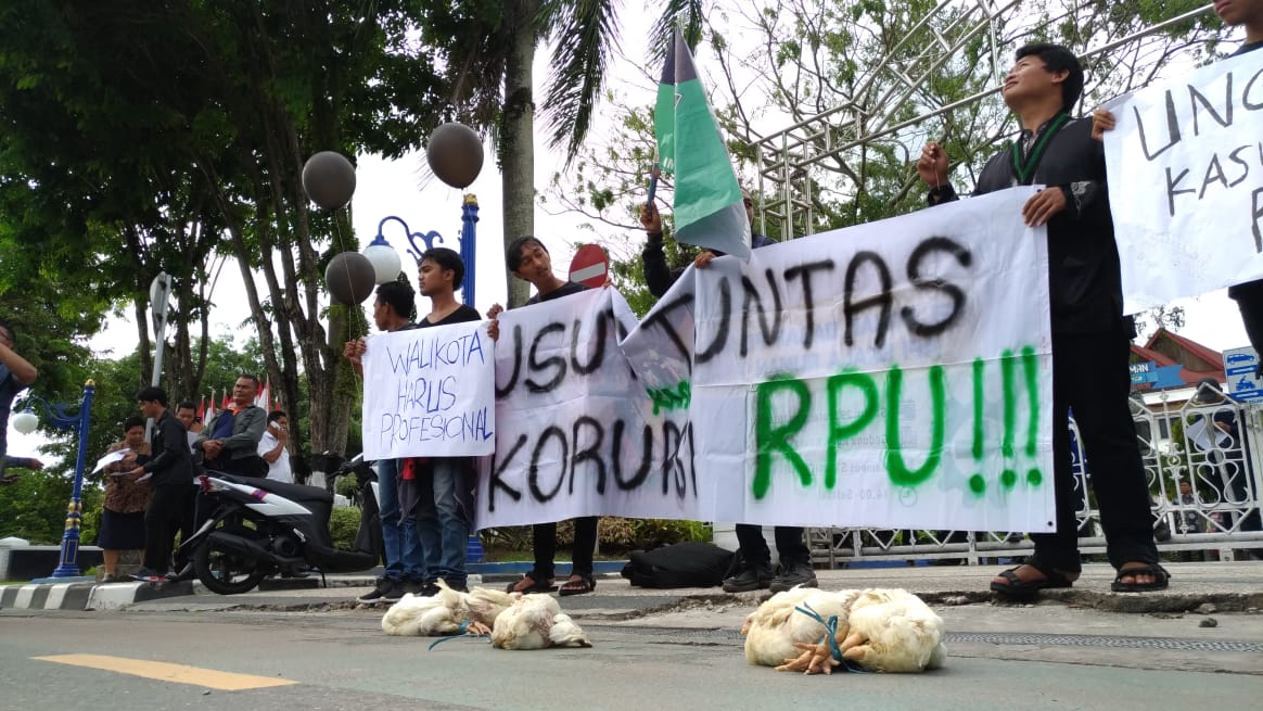 Demo RPU, Aktivis HMI Aksi Tutup Mulut dan Bawa Ayam