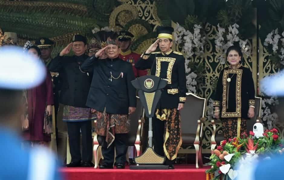 Sementara Ibu Negara Iriana juga mengenakan pakaian nasional yang serasi, semakin memperkuat nuansa kebangsaan dalam perayaan tersebut.