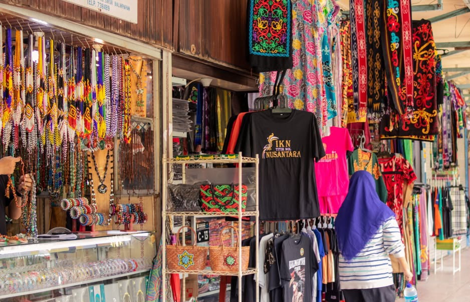 Kios kecilnya tampak semarak. Di gantungan atas, kaos-kaos bertuliskan “Borneo”, “Dayak”, dan “Ibu Kota Nusantara” bergoyang lembut tertiup angin. Di bawahnya, tersusun tas, dompet manik-manik, kain batik, sarung Samarinda, dan tenun khas Kalimantan yang warna-warni.