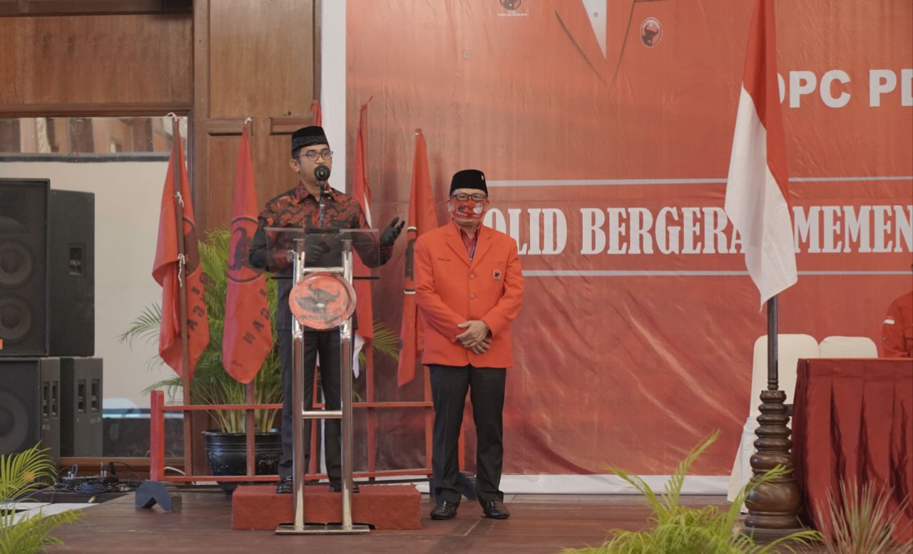Dalam sambutannya, Rahmad yang mengenakan batik berwana merah didampingi Ketua DPC Thohari Aziz yang juga calon wakil wali kota yang diusung sejumlah partai. Thohari yang mengenakan baju khas PDI Perjuangan berdiri bersandingan dengan Rahmad Mas’ud.