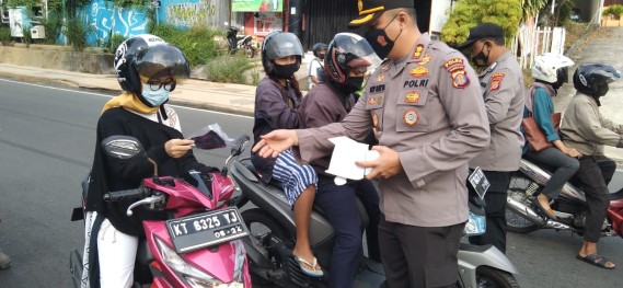 Tidak hanya membagikan masker, Dit Binmas Polda Kaltim juga memberikan sosialisasi protokoler kesehatan pencegahan virus corona.