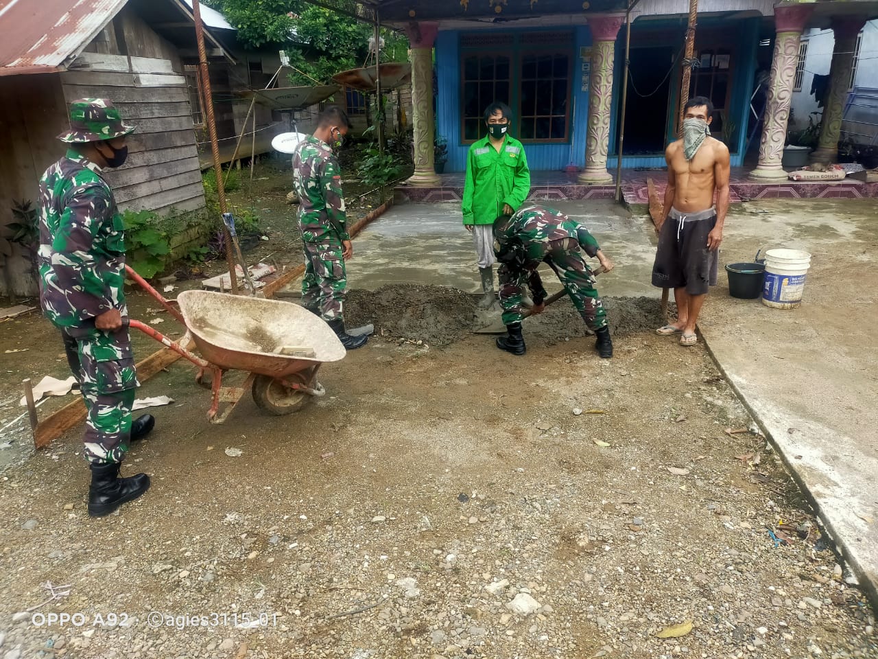 TANJUNG TABALONG. Inibalikpapan.com — Anggota Satgas TMMD 110 Pratu Agisman, Prada Anam dan Prada Ronaldi membantu pengecoran lantai rumah Ahmadi (52) warga di desa Lok Batu Rt. 02 Kecamatan Haruai, Senin (22/3/2021).