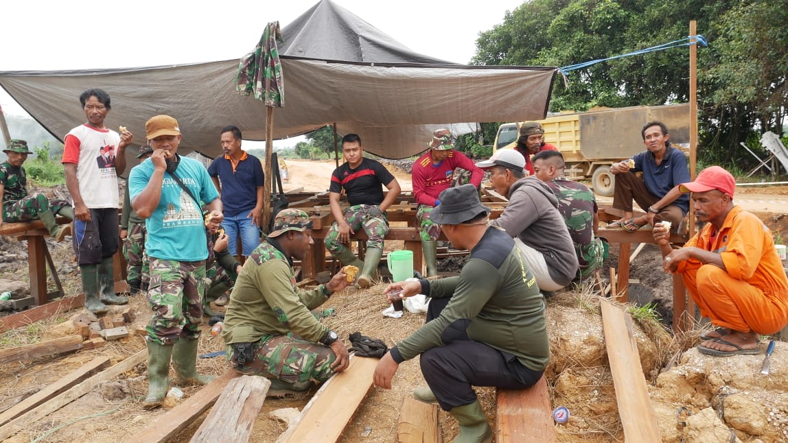 Disela sela kesibukan pembuatan jembatan sepanjang 6×8 meter anggota TNI menyempatkan bersenda gurau dengan warga yang membantu sembari makan singkong dan pisang goreng untuk menghela peluh dalam pengerjaan jembatan.