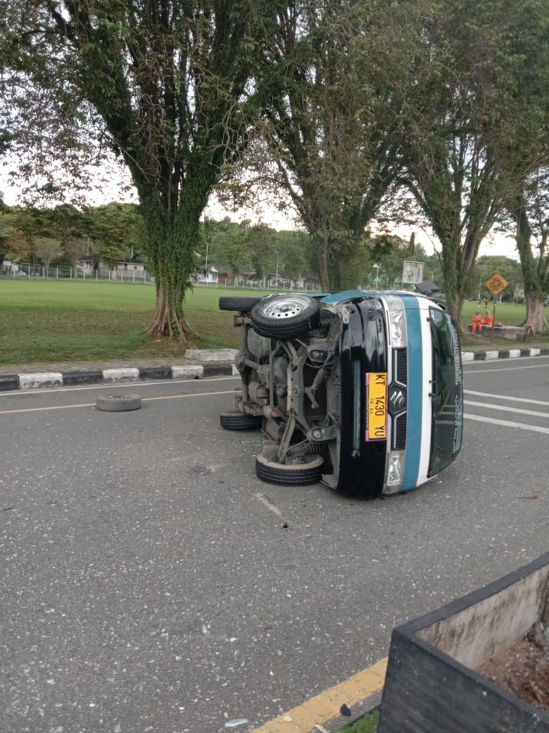 BALIKPAPAN, Inibalikpapan.com — Sekitar pukul 10.15 wita terjadi kecelakaan tunggal yang dialami kendaraan angkutan kota KT 1430 YU terbalik di sekitar Lapangan Merdeka depan Banua Patra jalan Jenderal Sudiriman, Balikpapan, Rabu (30/12/2020).