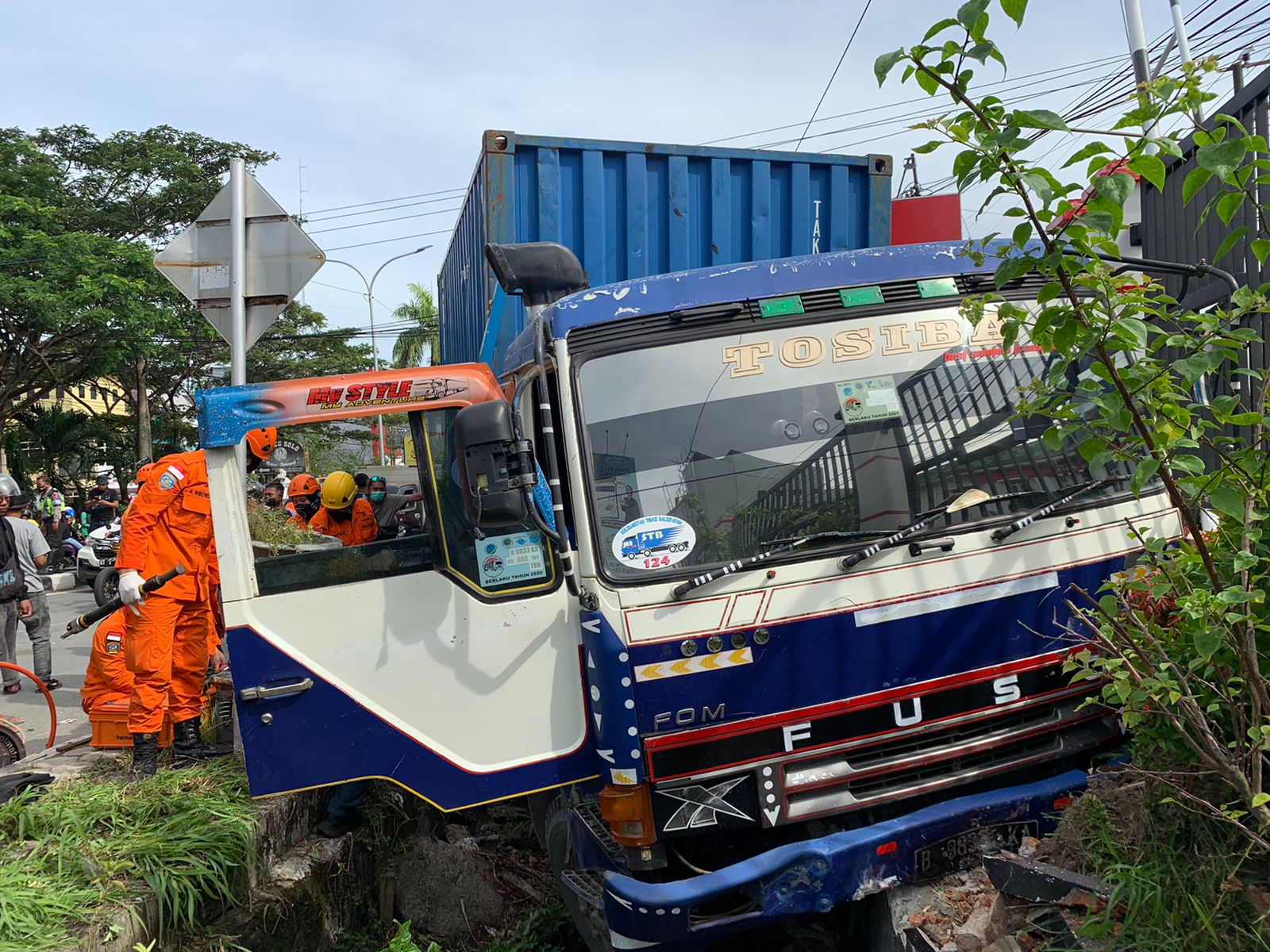 Saat kondisi truk naik diatas trotoar dan sebagian menabrak tembok perusahaan. Sekitar pukul 10.39 wita kendaraan ditarik oleh Dishub Balikpapan