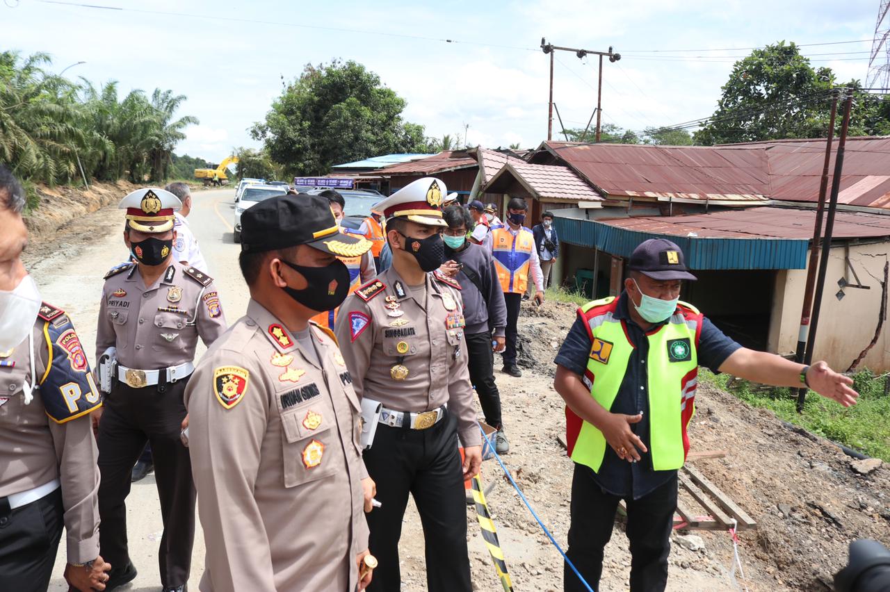 KUKAR – Dir Lantas Polda Kaltim Kombes Pol Singgamata dan Kapolres Kukar AKBP Irwan Masulin Ginting bersama tim gabungan melakukan pengecekan lokasi jalan Samarinda-Balikpapan yang longsor di area KM 7, Loa Janan Kutai Kartanegara, Senin (18/01/2021).