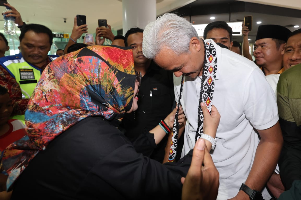 Setibanya di Bandara Sultan Aji Muhammad Sulaiman Sepinggan, Balikpapan, Kalimantan Timur, Ganjar langsung diberikan slayer manik-manik khas Kalimantan Timur sebagai bentuk sambutan selama datang.