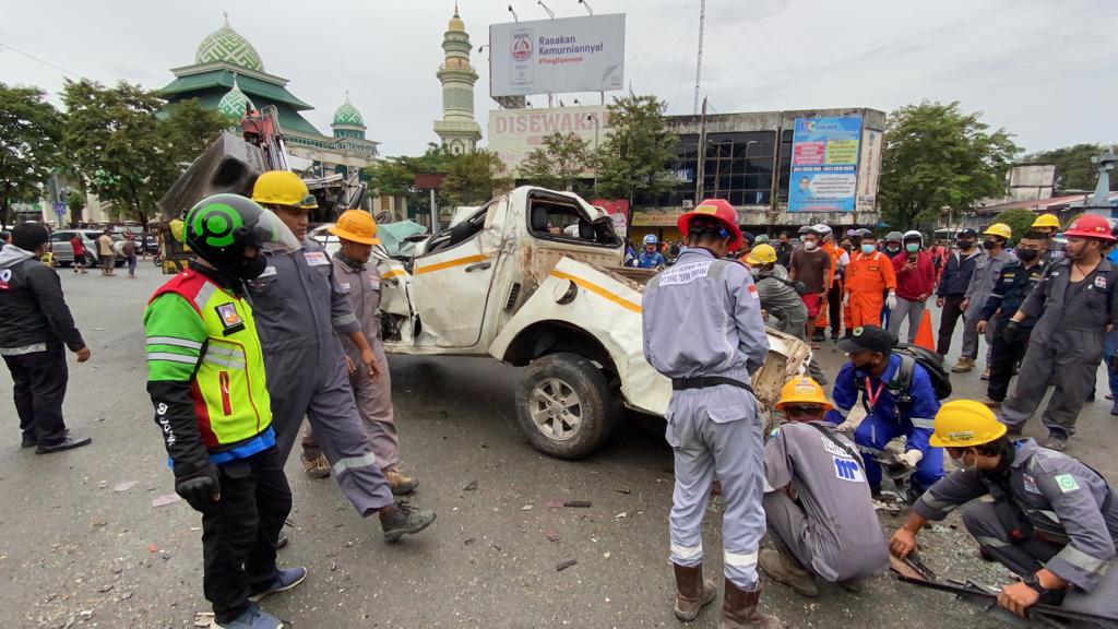 Hingga pukul 7.50 wita, proses evakuasi kendaraan rusak parah sedang dilakukan dinas perhubungan Kota dibantu petugas dan relawan.