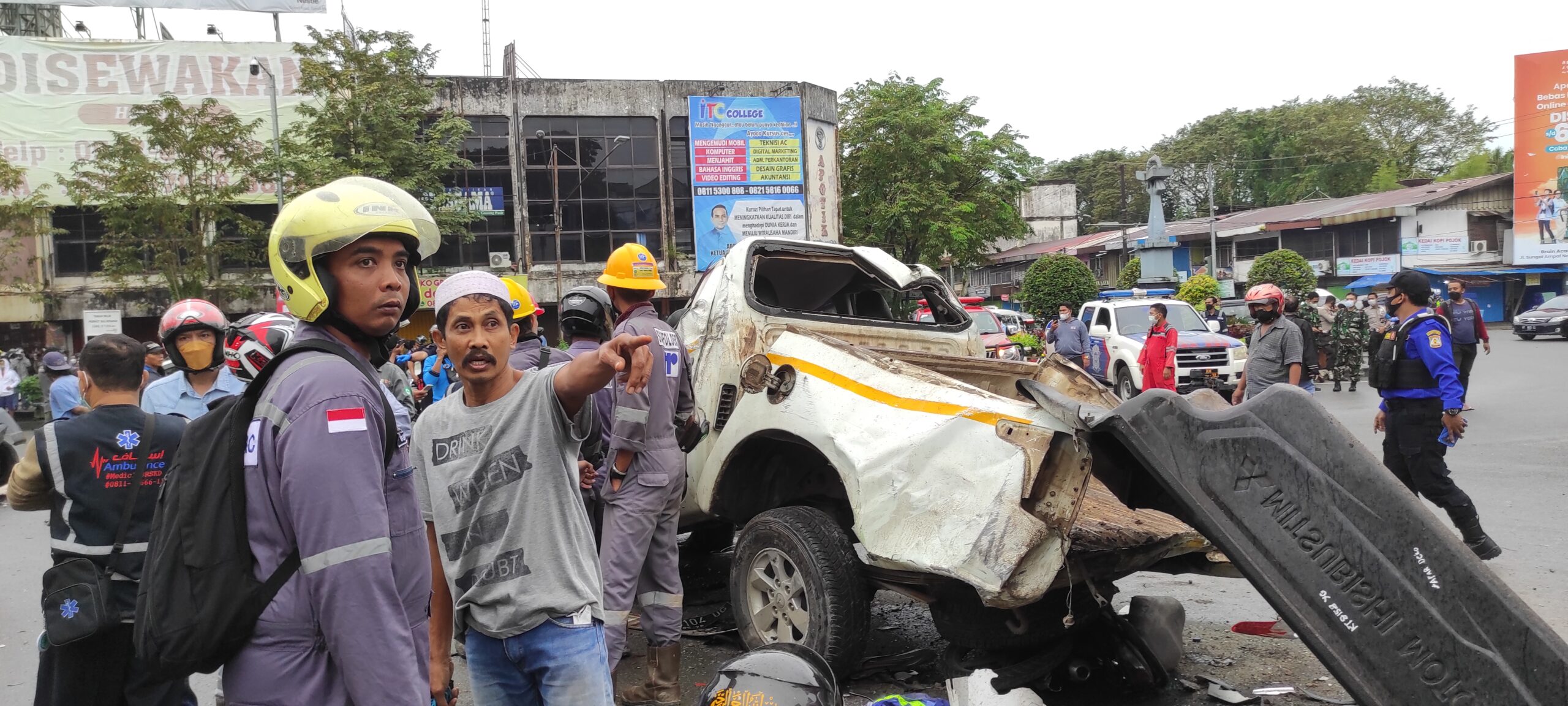 Hingga pukul 7.50 wita, proses evakuasi kendaraan rusak parah sedang dilakukan dinas perhubungan Kota dibantu petugas dan relawan.
