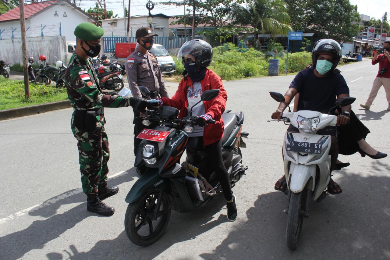 Dengan membagikan masker satu tempat ke tempat lainnya, dan diberikan kepada masyarakat yang berada di berbagai lokasi seperti Pasar dan Jalan umum dll. Aparat gabungan TNI-Polri dan Sat Pol PP mengajak masyarakat untuk terus mematuhi protokol kesehatan dan selalu menggunakan masker saat beraktivitas di luar rumah.