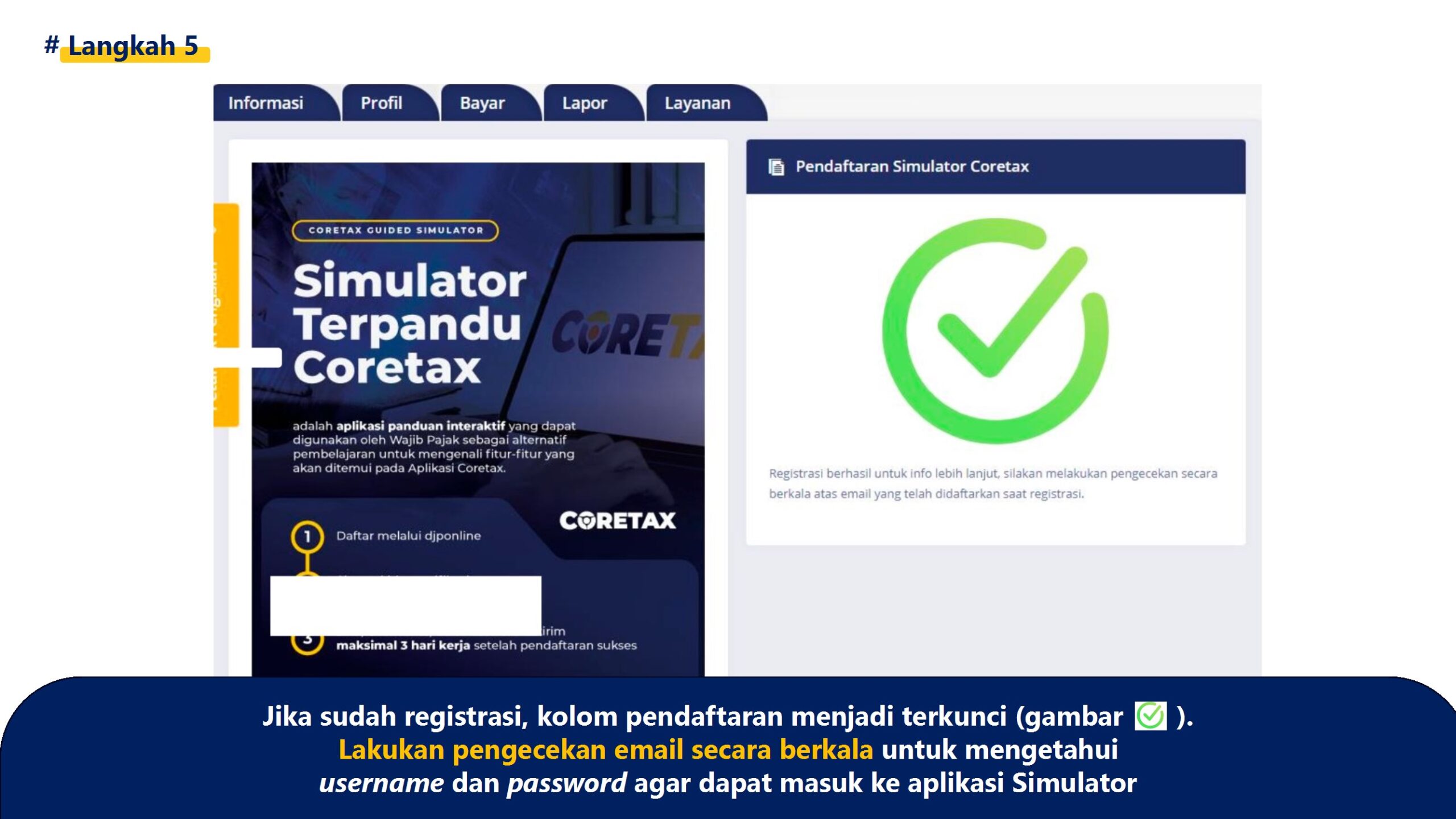 Untuk mengakses simulator ini, wajib pajak harus melakukan pendaftaran pada laman awal akun DJPOnline. Apabila pendaftaran berhasil, sistem akan memberikan notifikasi melalui alamat email yang terdaftar pada akun DJPOnline.