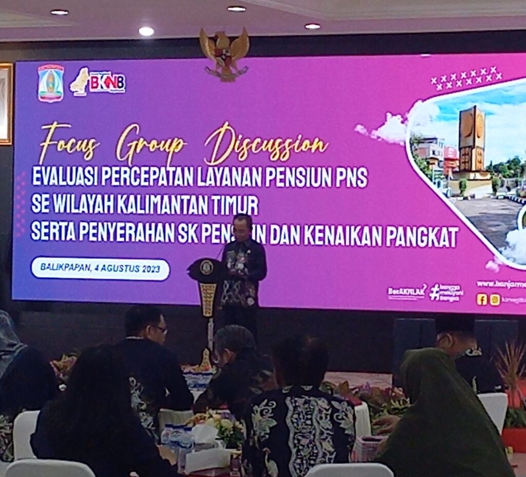 Badan Kepegawaian Negara (BKN) Kantor Regional VIII dilaksanakan kegiatan Fokus Group Diskusi (FGD) dengan Evaluasi Penyelesaian Pensiun dengan BKD/BKPSDM/BKPP Se-Wilayah Kalimantan Timur yang dilaksanakan di Aula Kantor Wali Kota Balikpapan pada, Jumat (4/8/2023).