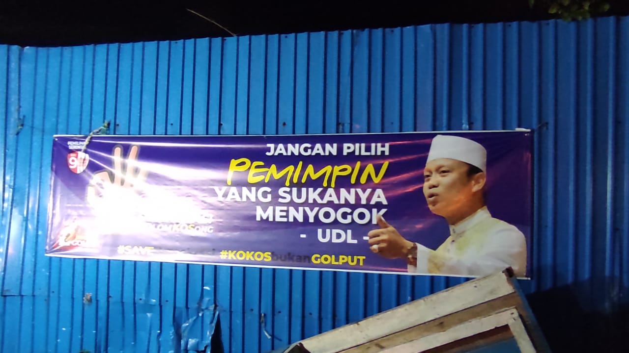 Salah satunya spanduk yang bertuliskan “Jangan PilihPemimpin yang Sukanya Menyogok” . Dalam spanduk tersebut, jelas terlihat foto Ustad asal Makassar itu, kemudian tetulis #SaVE dan #KOKOSbukanGOLPUT.