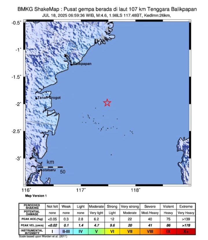 Hasil analisis BMKG menunjukkan episenter gempa berada pada koordinat 1.98 Lintang Selatan dan 117.48 Bujur Timur, tepatnya sekitar 107 kilometer tenggara Balikpapan, dengan kedalaman 26 kilometer.