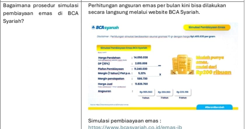 3. BCA Syariah diawasi oleh Dewan Pengawas Syariah untuk memastikan bahwa semua produk dan jasaya yang diberikan, termasuk pembiayaan Emas iB telah sesuai dengan prinsip syariah.