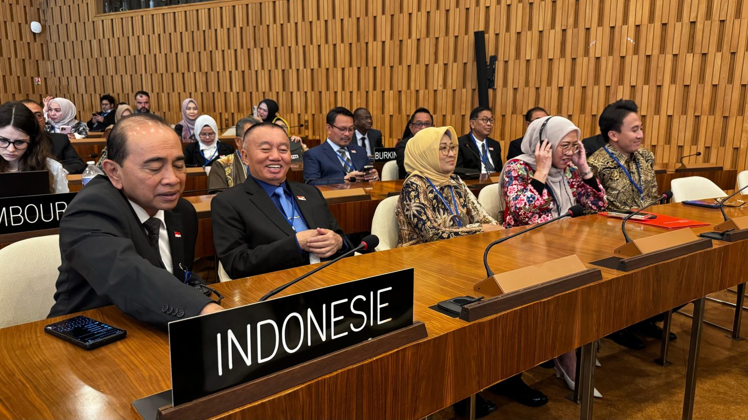 Direktur Jenderal UNESCO, Audrey Azoulay, menandatangani sertifikat yang diberikan kepada delegasi Indonesia. Muhidin didampingi Ketua Harian Geopark Meratus, Hanifah Dwi Nirwana, yang juga menjabat sebagai staf ahli menteri di Kementerian Lingkungan Hidup dan Kehutanan.