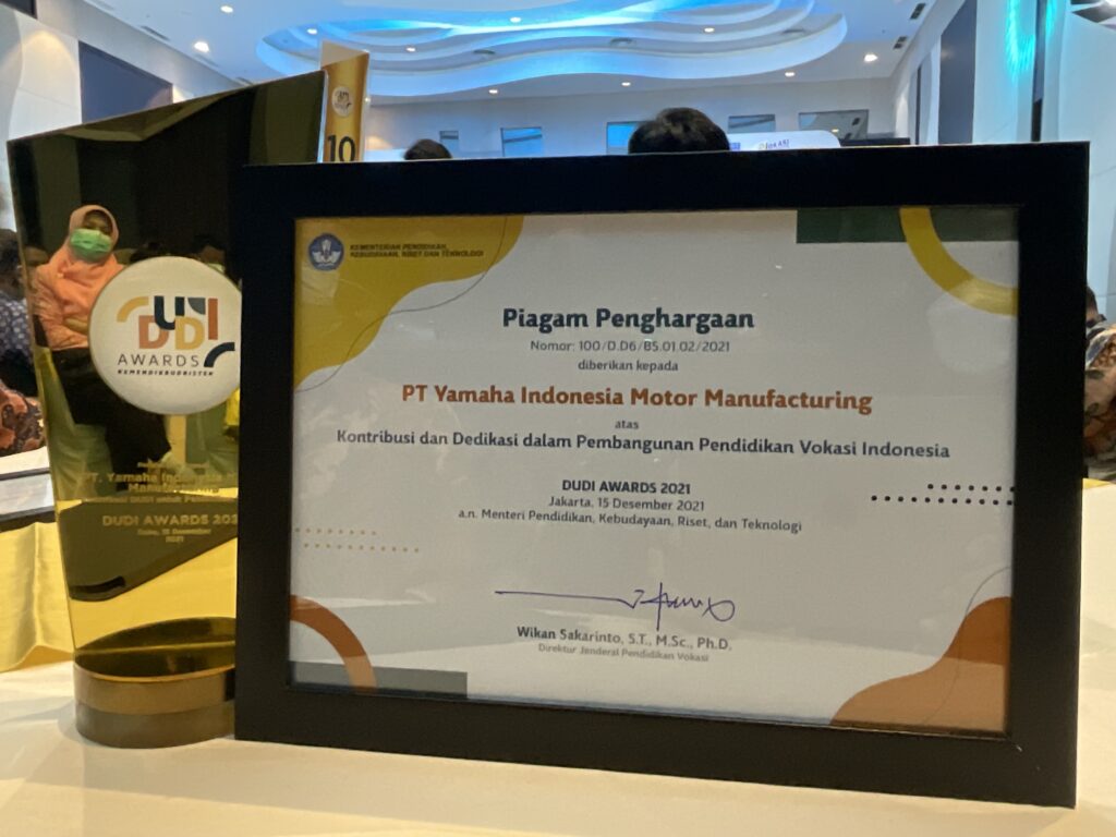 Giat dan aktifnya peran serta Yamaha menjalankan program CSR tersebut, diapresiasi oleh Pemerintah Indonesia lewat penghargaan yang diterima pada 15 Desember 2021 dari Kementerian Pendidikan, Kebudayaan, Riset, dan Teknologi (Kemendikbudristek), dalam Dunia Usaha Dunia Industri (DUDI) Awards tahun 2021.