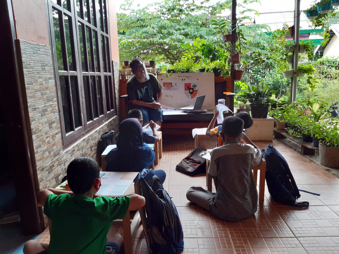 Pembelajaran dilangsungkan di teras rumah guru dengan minimal siswa per pembelajaran hanya lima siswa ini. Belajar luring ini menekankan membaca, mendengarkan, dan bercerita.