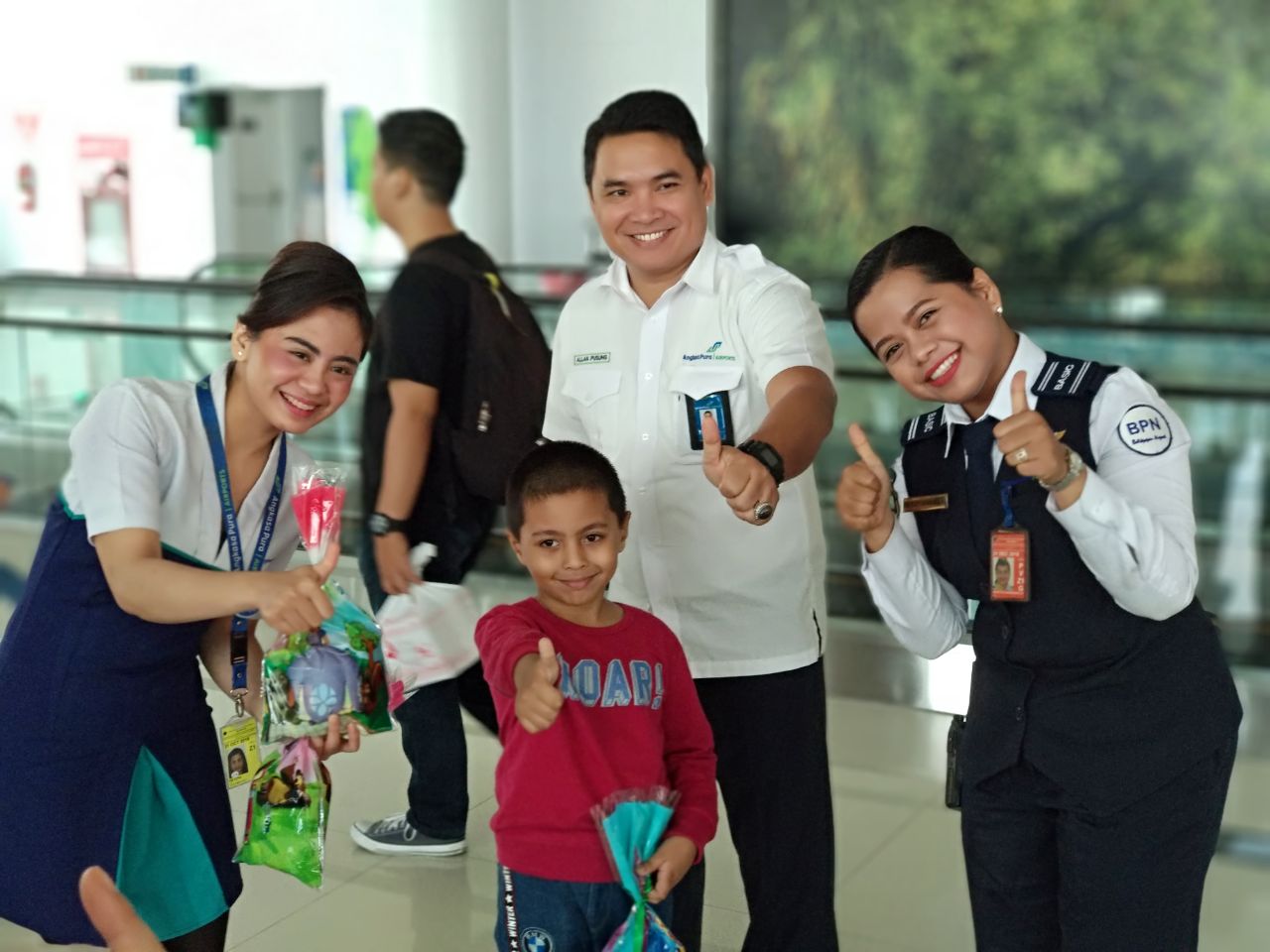 Sebanyak 50 bingkisan berupa souvenir dan makanan ringan dibagikan kepada anak-anak bersama orang tua saat berada di ruang tunggu keberangkatan dan Kedatangan.