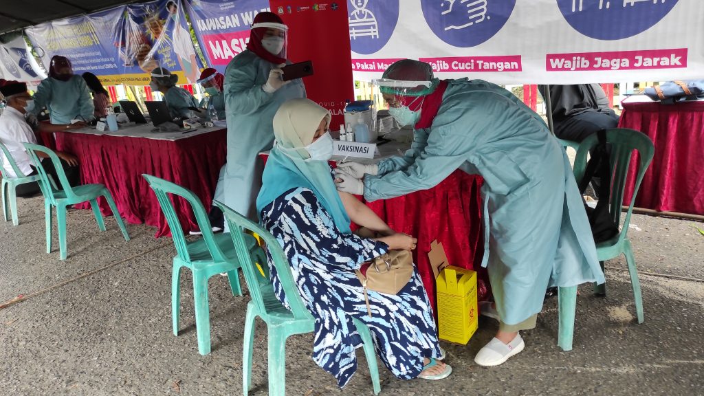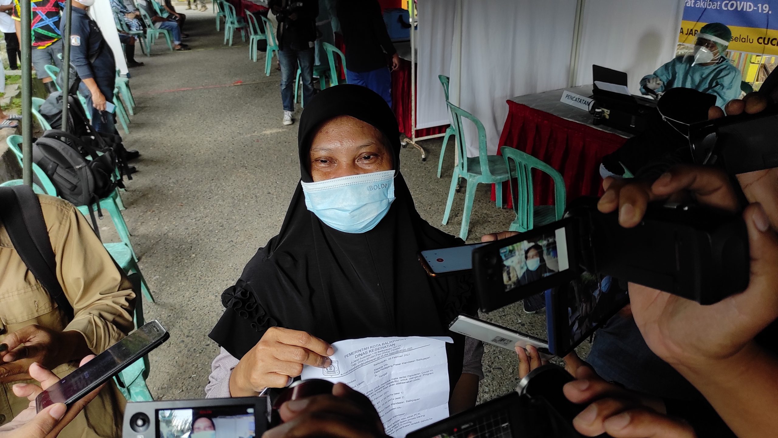 Barokah senang di vaksin karena untuk kesehatan dan menghindari terpapar Covid. ” Ngak sakit biasa saja. Semalam persiapan minum vitamin dan jahe, ” tutur pedagang sayur ini.