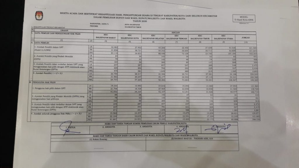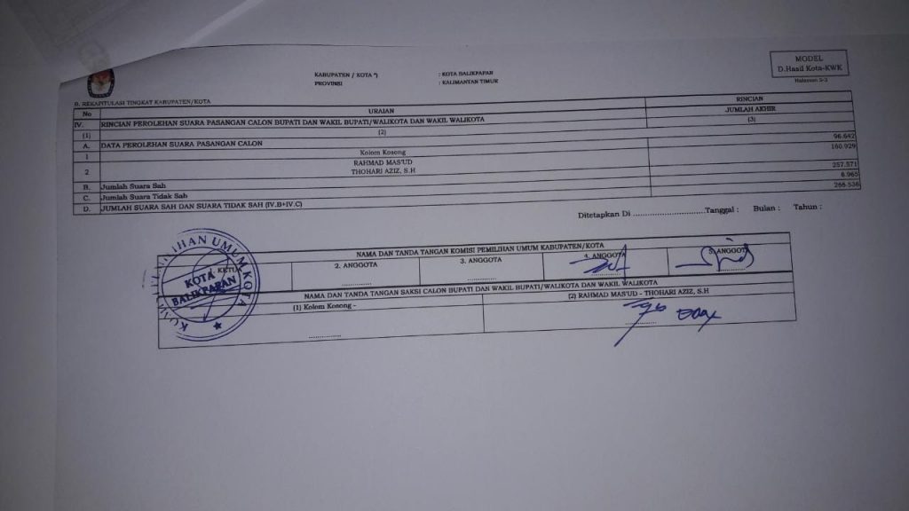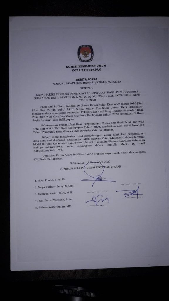 Hasil rapat pleno tersebut telah ditandatangani 3 Komisioner KPU Kota Balikpapan Noor Thoha, Yan Fauzi Wardana dan Ridwansyah Herman. Serta saksi paslon rahmad – Thohari.