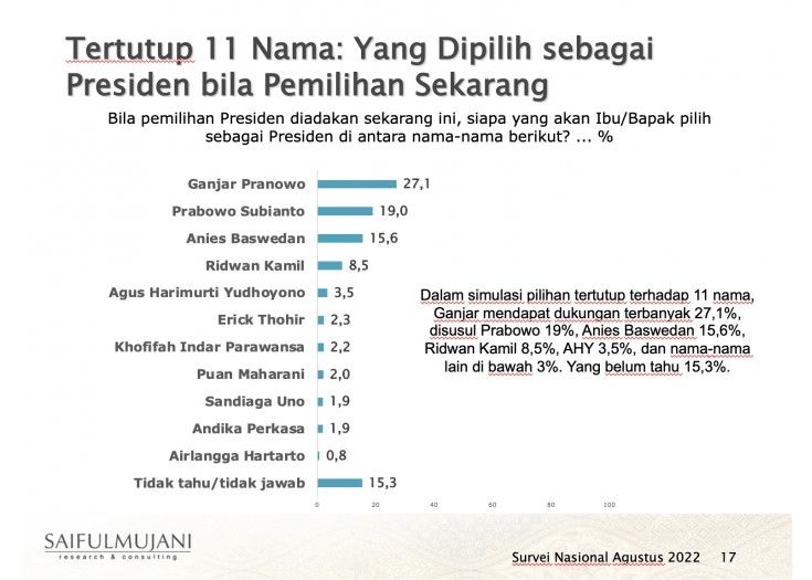 Pasalnya dari hasil survei terbaru SMRC, Gubernur Jawa Tengah itu masing unggul sekitar 27,1 persen, Jika dibandingkan dengan 11 nama lainnya yang disebut-sebut juga bisa jadi calon presiden.
