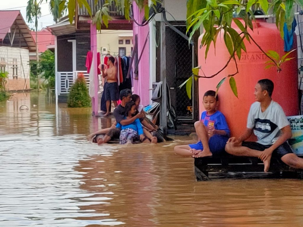 Anak-anak dan orang dewasa menikmati banjir di jalan Swadaya, Balikpapan Utara.