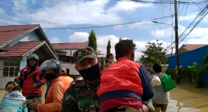 Seorang petugas TNI menggendong anak karena rumah terdampak banjir di Beller (foto IB Balikpapan)