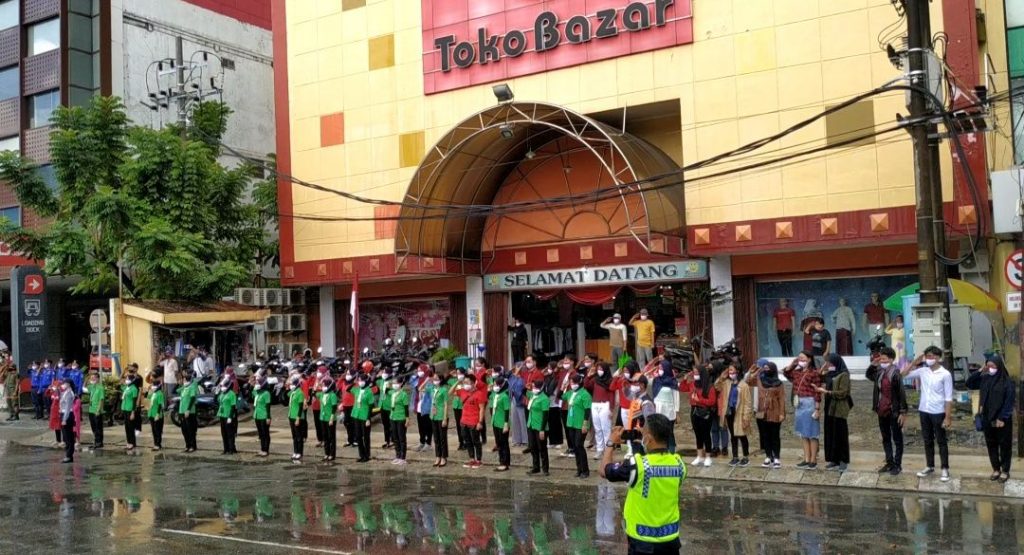 Penghormatan detik-detik kemerdekaan bukan hanya diikuti pengguna jalan tapi juga karyawan yang ada di sekitar simpang seperti Super Bazar, Plaza dan ruko-ruko.