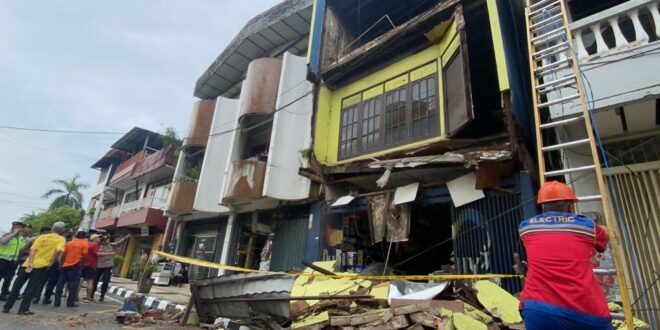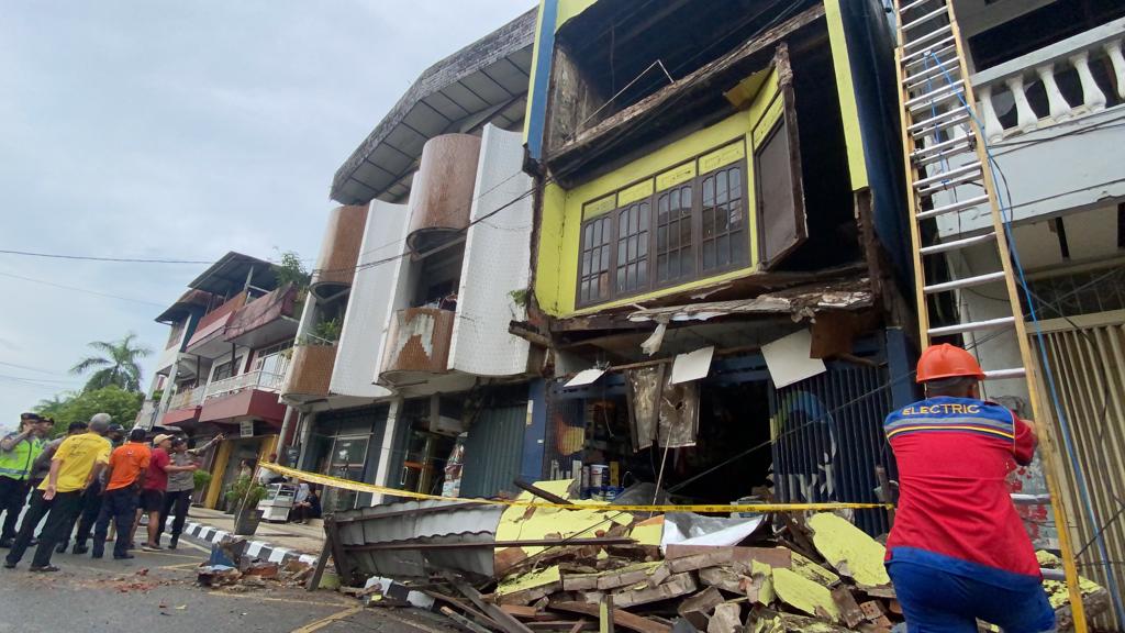 “Awalnya sekitar pukul 09.00 wita ada jatuh satu balok habis gak lama saya lihat ada retakan besar dan tembok sama teras ruko saya terturun,” ujar Rudi kepada awak media, Jumat (14/4/2023).