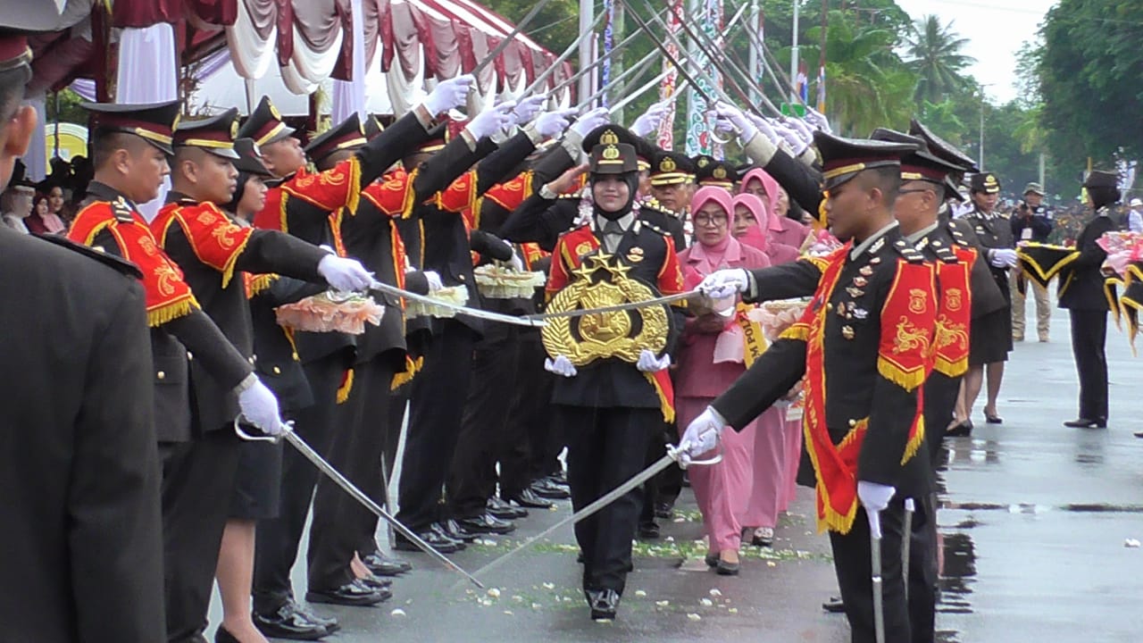 Acara apel HUT Polri juga dimeriahkan penampilan pedang pora, dirigen, dan defile pasukan Polri disaksikan ribuan warga Balikpapan.