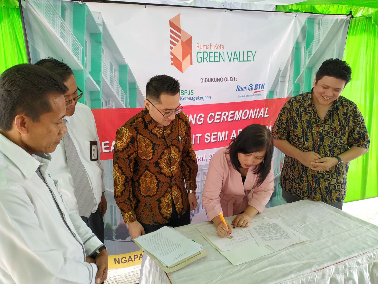 “Kami punya tagline daripada ngontrak lebih baik beli hunian di tengah kota tapi harga pinggiran,” ujar Dirut Christopher Sumasto PT Karya Bersama Anugarah saat menyaksikan penandatanganan realisasi kredit semi apartemen oleh kreditur Ellin Miranda sebagai pemilik pertama realiasasi akad FLPP dengan BTN Balikpapandisaksikan Kepala BPJS Ketenagakerjaan, Notaris di halaman Apartemen Green Valey, Senin siang (28/1).