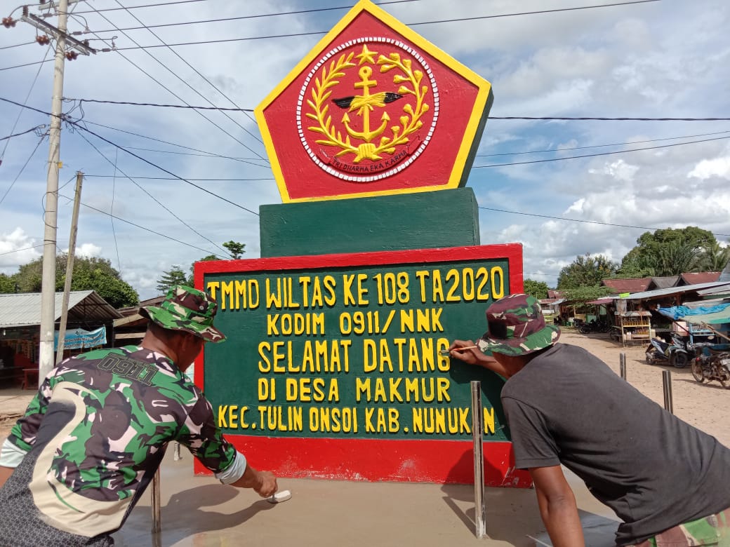 Koptu Hendrik yang saat itu tengah asik melakukan pekerjaan finishing tugu mengatakan, “Ini sudah masuk tahap finishing pembangunan tugu prasasti TMMD ke-108 Kodim Nunukan, semoga dengan selesainya tugu ini bisa menjadi kenangan tersendiri bagi kami (TNI) dan masyarakat Desa makmur”.