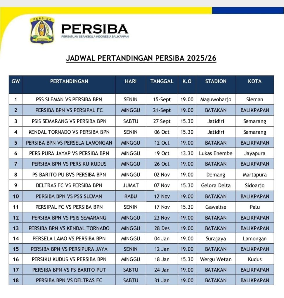 Jadwal Lengkap Persiba Balikpapan di Liga 2 2025/2026