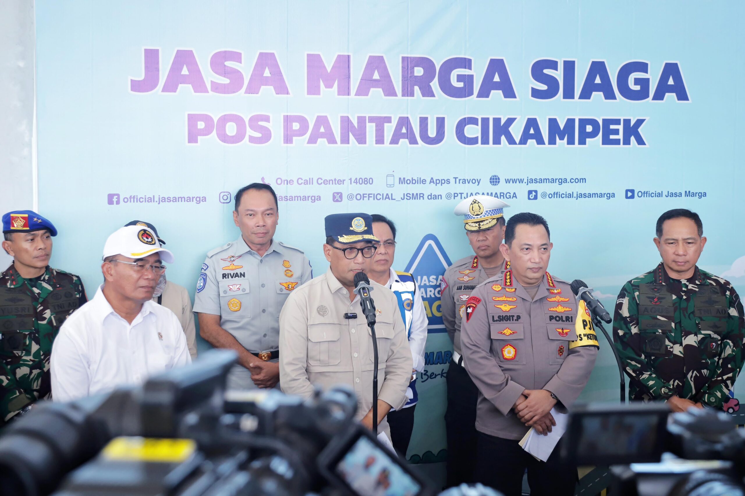 Direktur Utama Jasa Raharja Rivan A. Purwantono, bersama Menko PMK Prof. Dr. Muhadjir Effendy, M.A.P., Menteri Perhubungan Dr. Ir. Budi Karya Sumadi; Kapolri Drs. Listyo Sigit Prabowo, M.Si., Panglima TNI Jenderal TNI H. Agus Subiyanto, S.E., M.Si, dan Kakorlantas Polri Irjen. Pol. Dr. Drs. Aan Suhanan, M.Si.,melakukan rapat koordinasi dan evaluasi mudik dan arus balik Lebaran 2024 di Kantor Jasa Marga, GT Cikatama Km 70, Senin (15/04/2024).