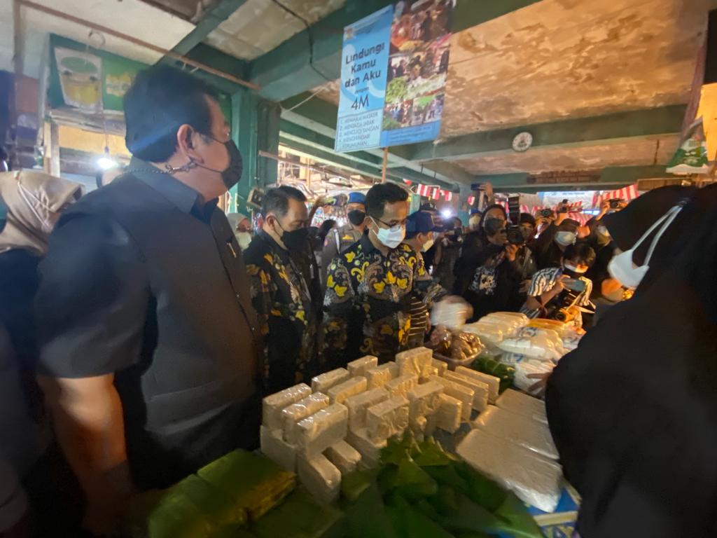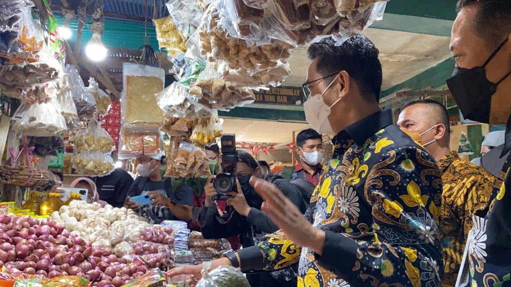 Dari pantauan media di lokasi, Rahmad Mas’ud yang mengenakan pakaian baju batik menanyakan satu persatu jenis barang di pasar mulai dari gula, telur, cabai, minyak goreng, bawang, hingga daging.