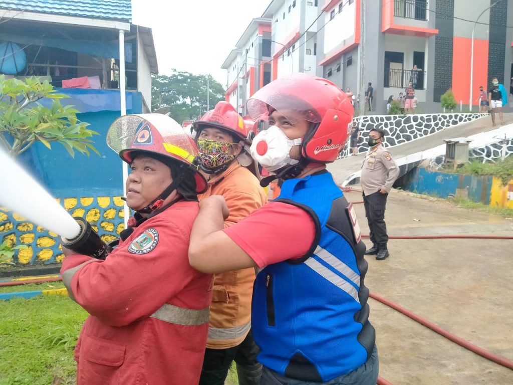 Dalam pemadaman api, petugas kebakaran, bersama petugas Pol Air dibantu relawan berjibaku menjinakkan api yang melahap bangunan.