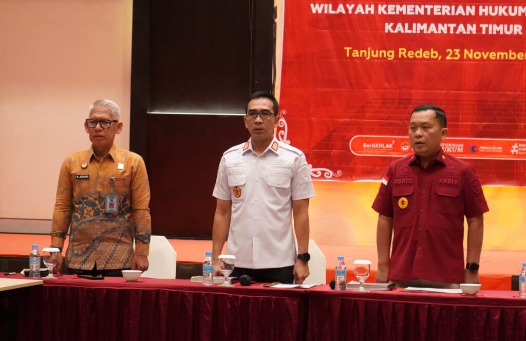 TANJUNG REDEB – Kepala Kantor Wilayah Kemenkumham Kalimantan Timur, Gun Gun Gunawan membuka kegiatan Rapat Koordinasi (Rakor) Evaluasi dan Capaian Kinerja TA. 2023 di Tokyo Ballroom Hotel Bumi Segah Tanjung Redeb, Kamis (23/11/2023).