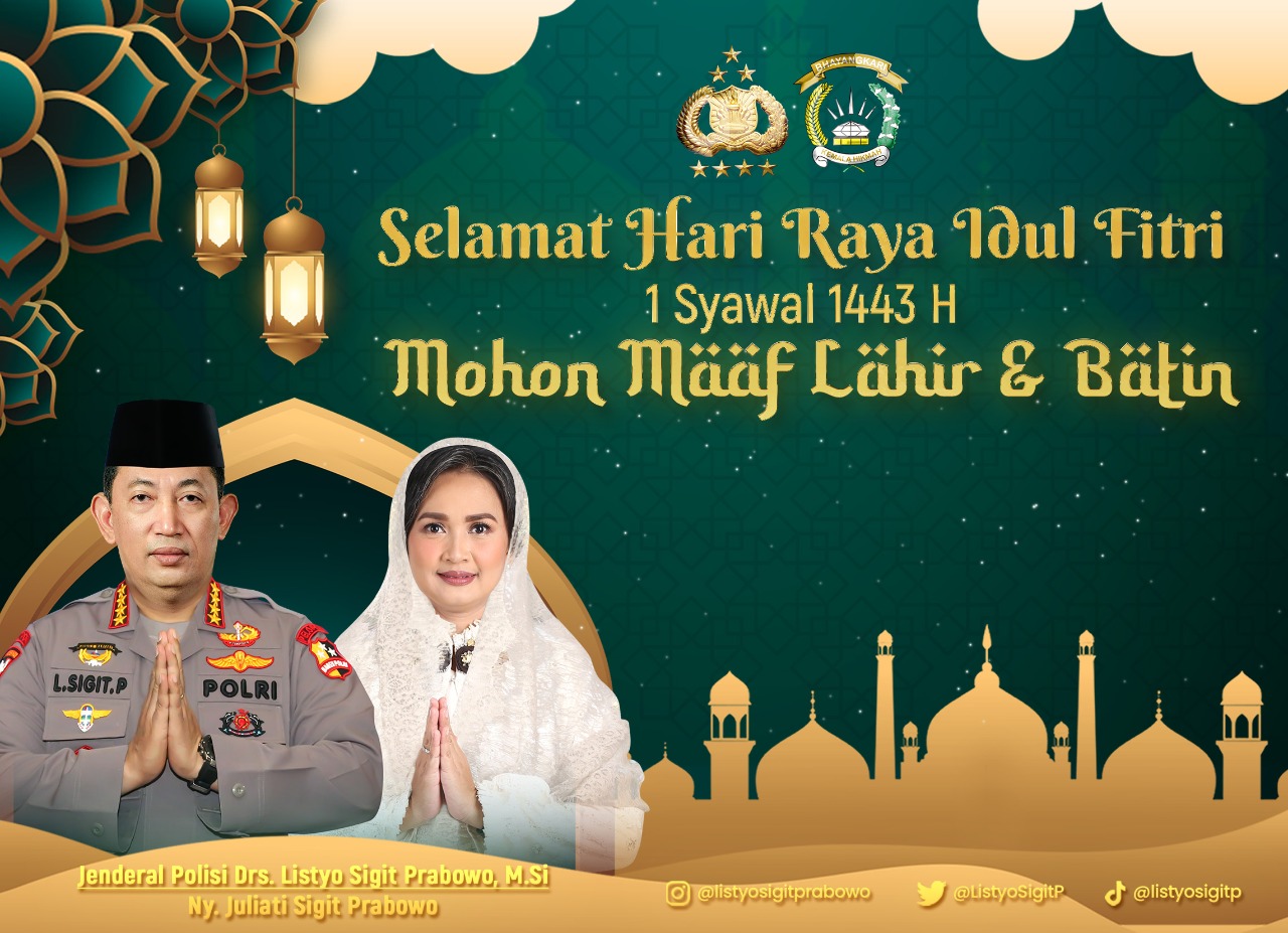 Jakarta – Kapolri Jenderal Listyo Sigit Prabowo menyampaikan selamat merayakan Hari Raya Idulfitri 1443 Hijriah kepada seluruh umat Muslim di Indonesia. Ia berharap perayaan ini dapat dijadikan momentum untuk seluruh masyarakat kembali ke fitrah.