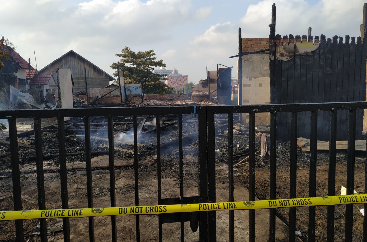Dari lokasi kebakaran, polisi memasang garis polisi di pagar rumah kosong bekas tempat bimbel yang pertama kali api muncul.