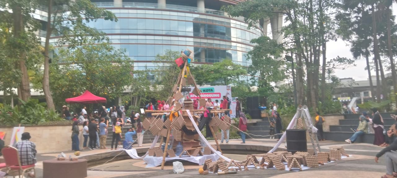 Instalasi tersebut disusun dari kardus telur, bambu, dan kain bekas—simbol kepedulian terhadap lingkungan sekaligus kreativitas warga.