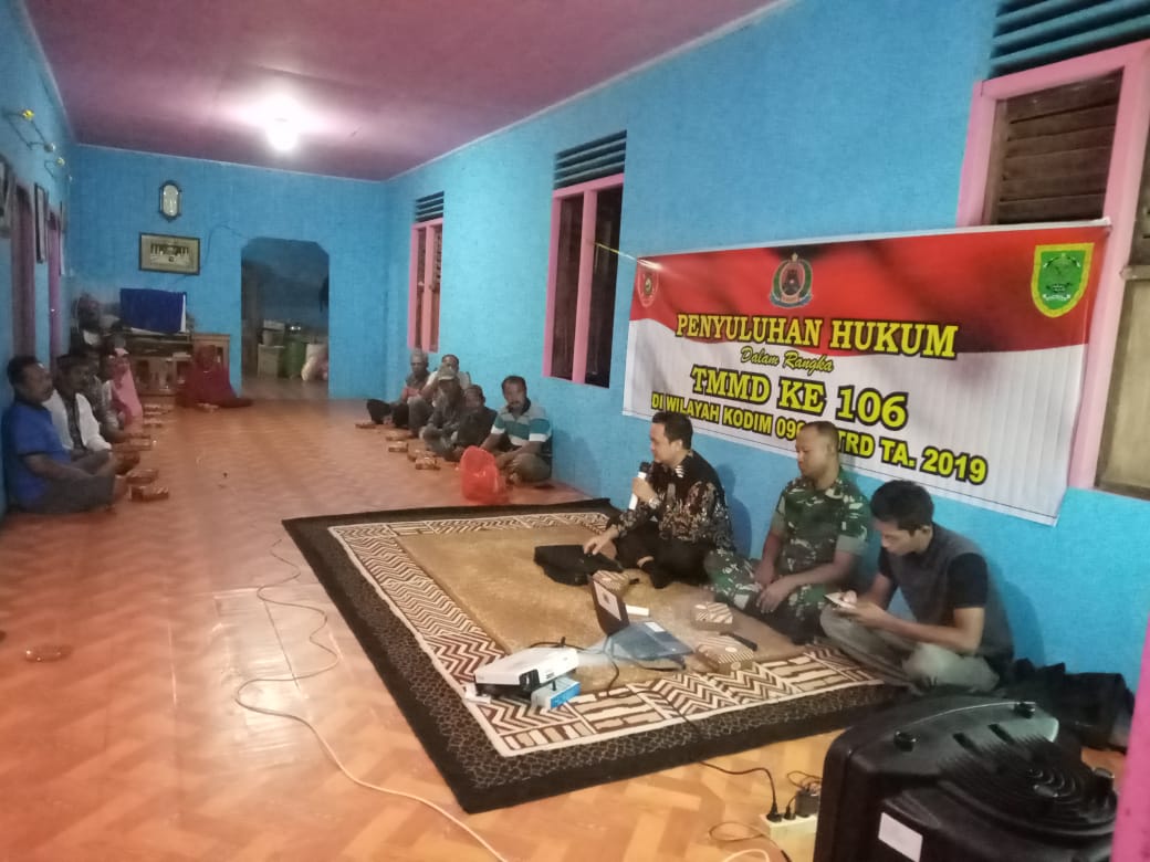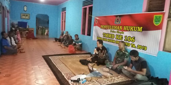 Pelda Hengky, Bati Komsos Sterdim 0902/Trd mewakili Pasiter Kodim beserta beberapa anggota satgas TMMD dan warga menerima penyampaian materi. “Meskipun berada jauh dari perkotaan masyarakat RT 21 Limunjan dan RT 20 Sei Buntu layak memiliki pengetahuan tentang hukum,” kata Hengky.