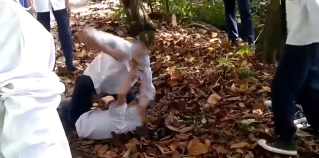 Dalam video berdurasi 2 menit 49 detik itu, terlihat seorang siswa terduduk di kursi rambutnya dijambak siswa lainnya sambil berdiri. Sementara beberapa siswa lainnya mengelilinginya.