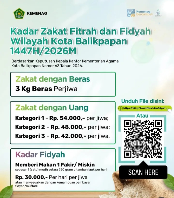 BALIKPAPAN,Inibalikpapan.com — Kantor Kementerian Agama (Kemenag) Kota Balikpapan menetapkan besaran zakat fitrah Ramadan tahun ini sebesar 3 kilogram beras atau dalam bentuk uang dengan nominal bervariasi, mulai dari Rp42.000 hingga Rp54.000, menyesuaikan kemampuan masyarakat.