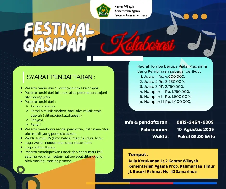 SAMARINDA, inibalikpapan.com – Kantor Wilayah Kementerian Agama (Kanwil Kemenag) Provinsi Kalimantan Timur akan menggelar Festival Qasidah Kolaborasi 2025 pada Minggu, 10 Agustus 2025.