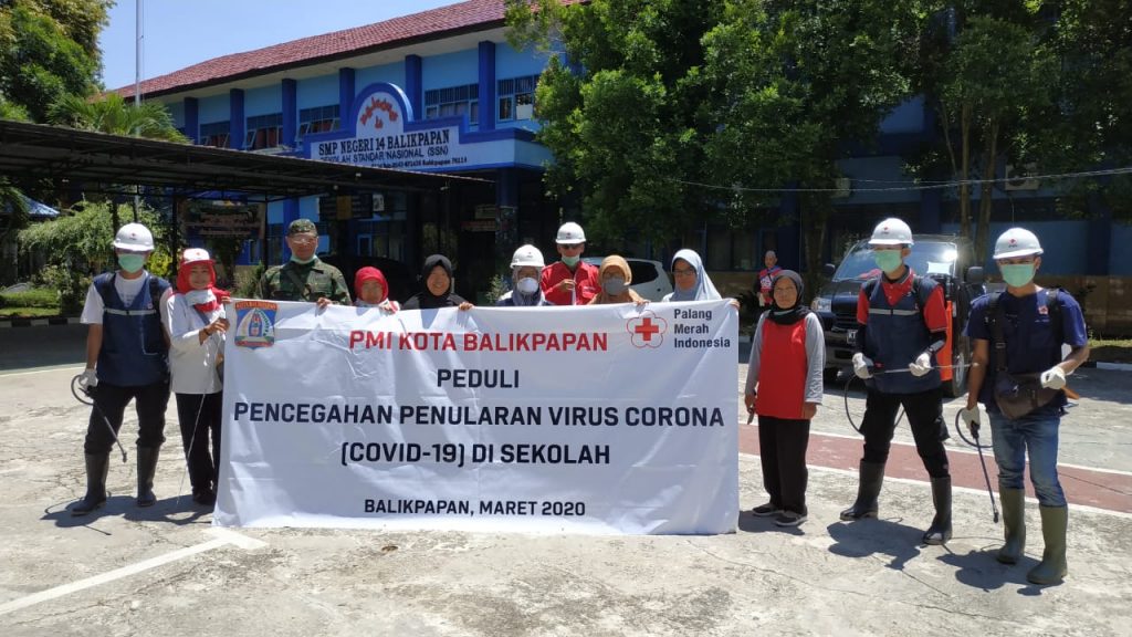 Mengandengn puluhan tenaga sukarelawan, PMI dan anggota TNI serta didukung Pemerintah Kota Balikpapan melakukan penyemprotan disinfektan. Penyemprotan dilakukan terhadap belan sekolah negeri dan swasta khususnya SD maupun SMP.