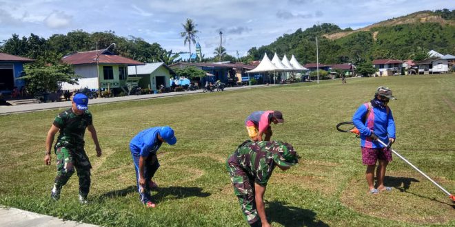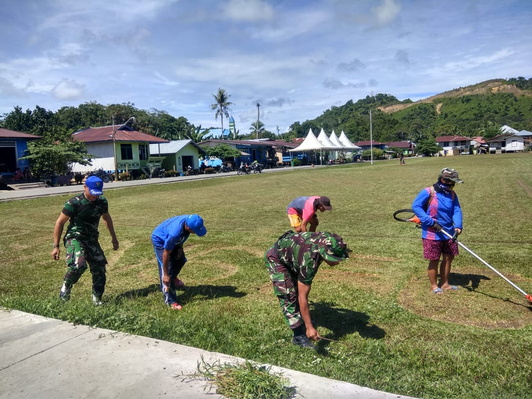 Selasa (29/10/2019), puluhan warga setempat bersama personel TNI bahu membahu melaksanakan kerja bakti membersihkan lapangan dan memasang umbul-umbul di lapangan yang akan dipergunakan untuk acara penutupan TMMD 106.